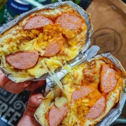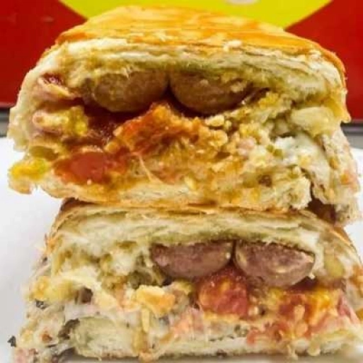 Pão de hot-dog, salsicha, maionese da casa, frango cremoso, tomate, bacon, mussrela, catupiry e cheddar.