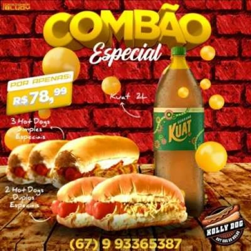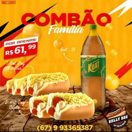 02 hot-dog duplo especial, 03 Hot-dog simples especial e 01 guaraná Kuat 2L