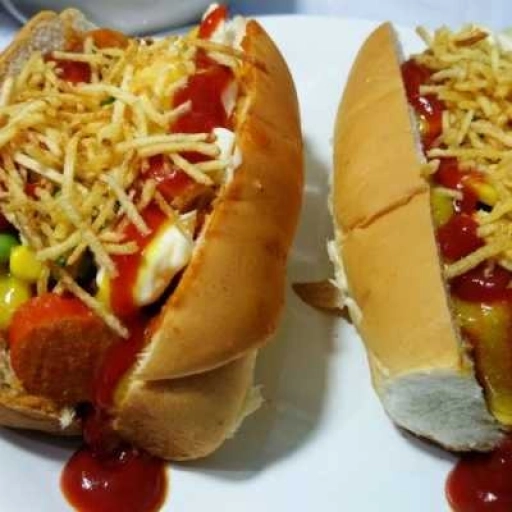 Pão de hot-dog, 02 salsichas, molho de tomate de casa, mussarela, milho verde, purê de batata e batata palha.