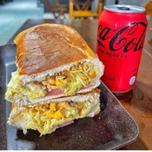 Pão de hot-dog, maionese, salsicha, milho verde, frango, mussarela, catupiry, tomate e batata palha.