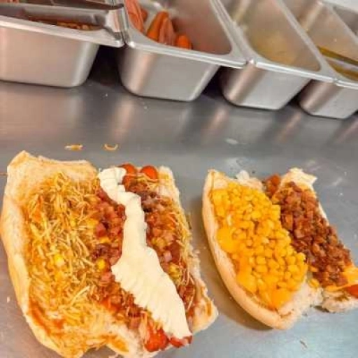 Pão de hot-dog, maionese, salsicha, milho verde, frango, bacon, calabresa, mussarela catupiry, tomate e batata palha